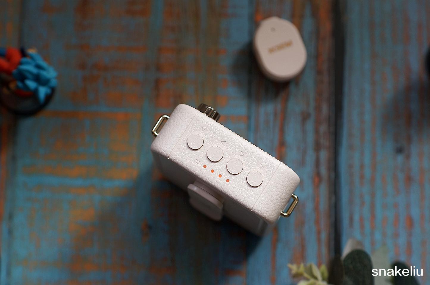 西圣BEE的顶部是四颗LED灯用来显示电池情况,还有四颗功能按键用来控制播放、切歌、模式转换,背面还设计了方便挂在腰间的皮带夹,可以把西圣BEE很方便的挂在腰间。