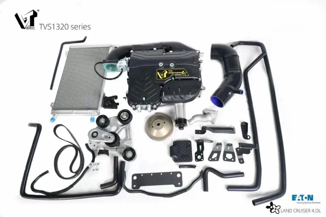 机械增压套件是根据丰田 LC76 原车预留孔位进行设计的,属于替换式无损加装,安装过程中不切割、不打孔、不焊接,也不破坏发动机内部结构,只需通过皮带连接曲轴轮带动增压器即可,安装较为便捷,一般在 6小时左右完成安装。
