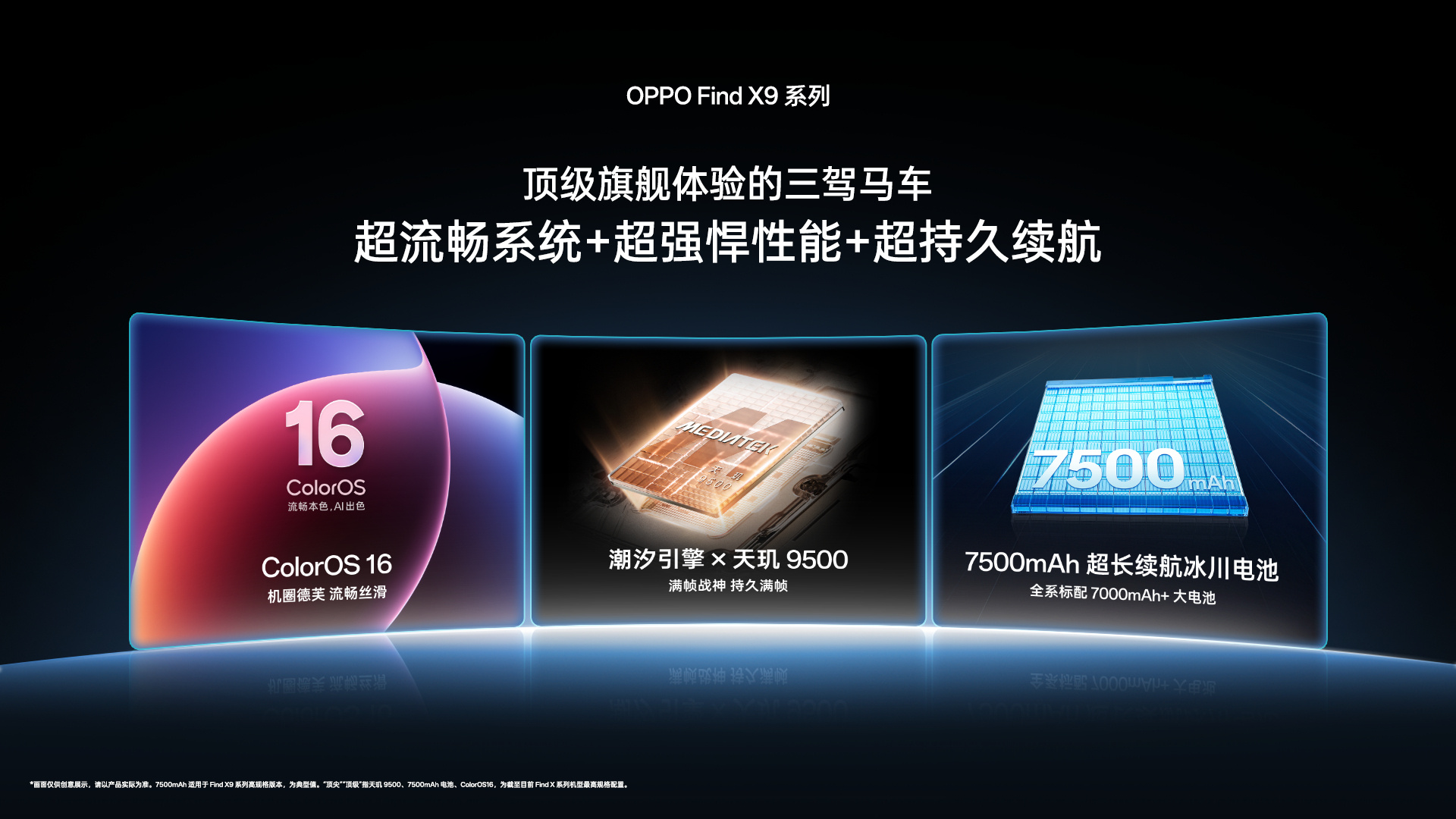 OPPO Find X9系列确认全系搭载天玑9500旗舰芯,同时还带来了流畅丝滑的「机圈德芙」ColorOS 16系统,以及Pro版7500mAh、标准版7025mAh的超长续航冰川电池!超流畅系统+超强悍性能+超持久续航,如同「三驾马车」齐驱并进,带来顶级旗舰体验。
