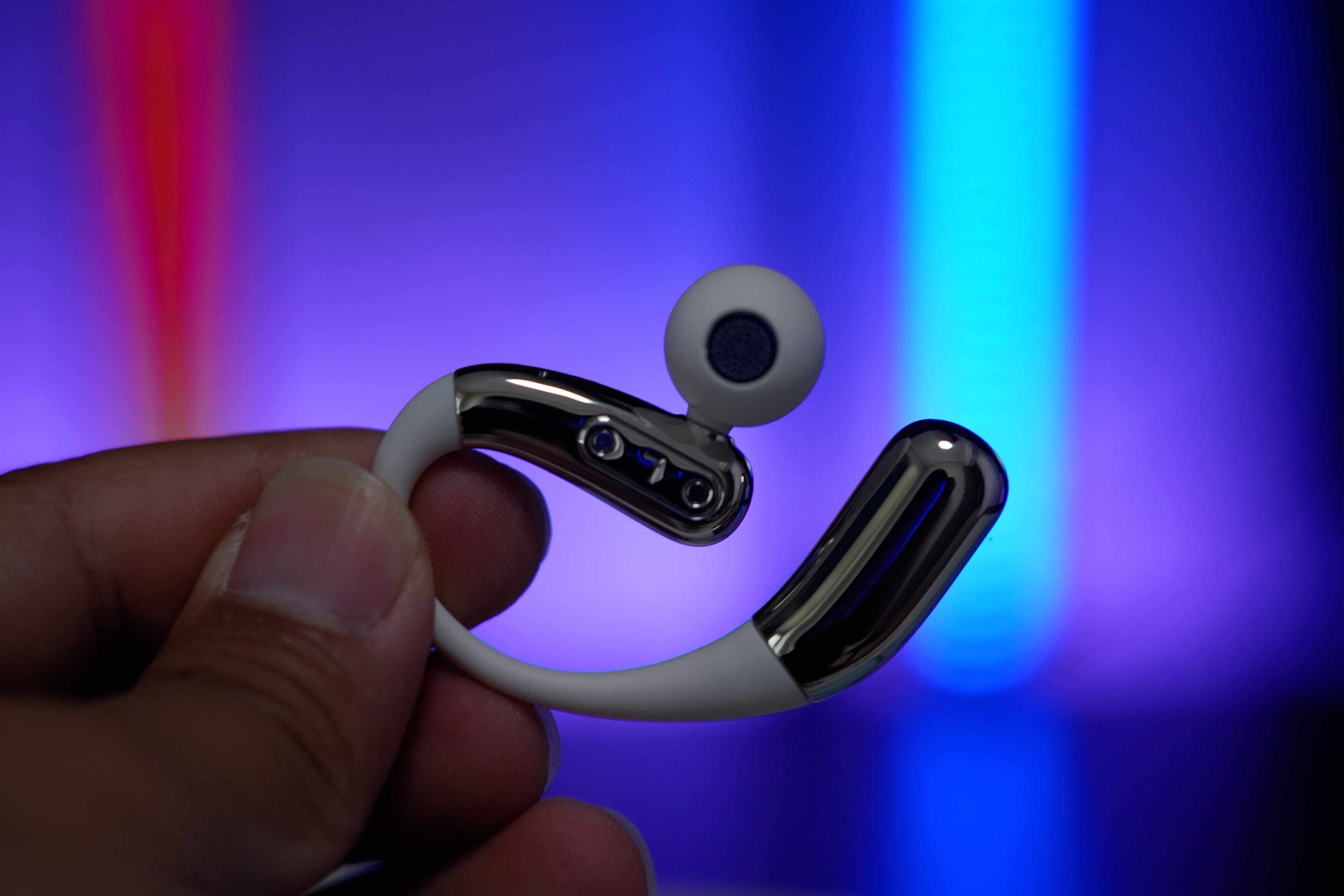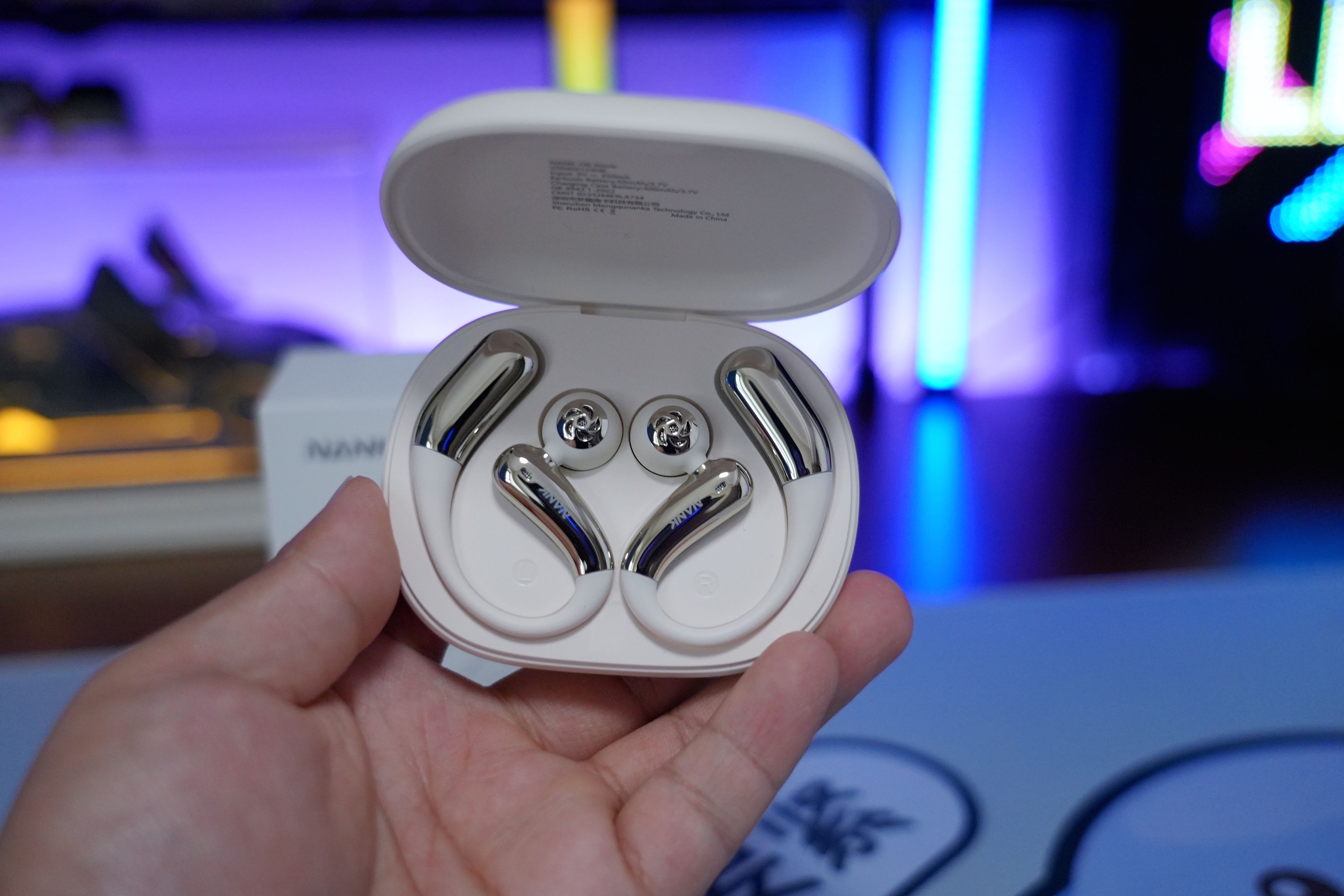 对开放式耳机来说,戴得舒服比什么都重要。南卡OENova这点做得是真到位,它单耳才5.8克,轻得跟没戴一样。我之前戴过那种挂耳式耳机,半小时耳朵就开始疼,这款我试过戴着连续工作4小时,居然没什么感觉。后来才知道它是根据上万组耳型数据设计的,耳挂曲线刚好贴合耳轮和耳后根,压力分散得很均匀,所以戴久了也不勒。