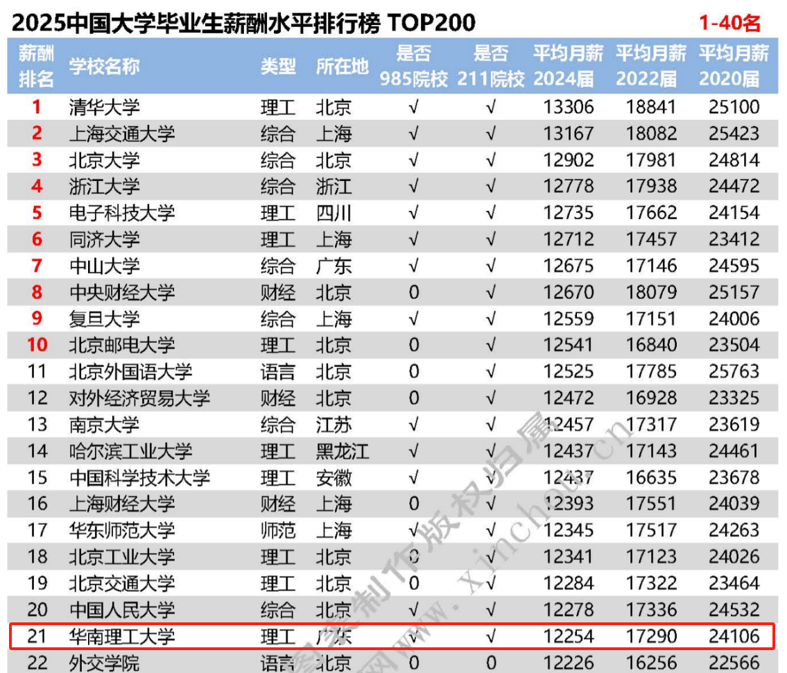 尤其是中国薪酬网发布的《2025年全国高校毕业生薪酬排行榜TOP200》,采用全国各高校上年度毕业生进入用人单位满一年的薪酬数据,包括基础工资、奖金和补贴等年度总收入,既有极高的参考价值。值得注意的是,在这份榜单中,华南理工大学毕业生平均薪酬超1.2万,位列全国第21名、广东地区第2名。