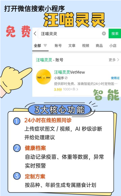 专业养宠指南:内置丰富的养宠知识库,涵盖幼宠喂养、成年宠护理、老年宠照护、常见疾病预防(如猫瘟、猫癣、肾病等)、急救方法等内容,遇到问题时可随时查阅,AI大模型还能根据宠物年龄和健康状况,获取专属的饮食、运动、护理建议,让新手铲屎官也能快速上手科学养宠。