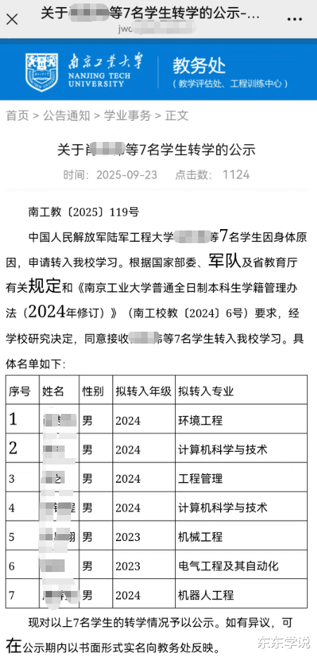 南京工业大学教务处9月下旬发布公示,公示了陆军工程大学肖某某等7名学生因身体不适,申请转学到本校(具体见截图)。