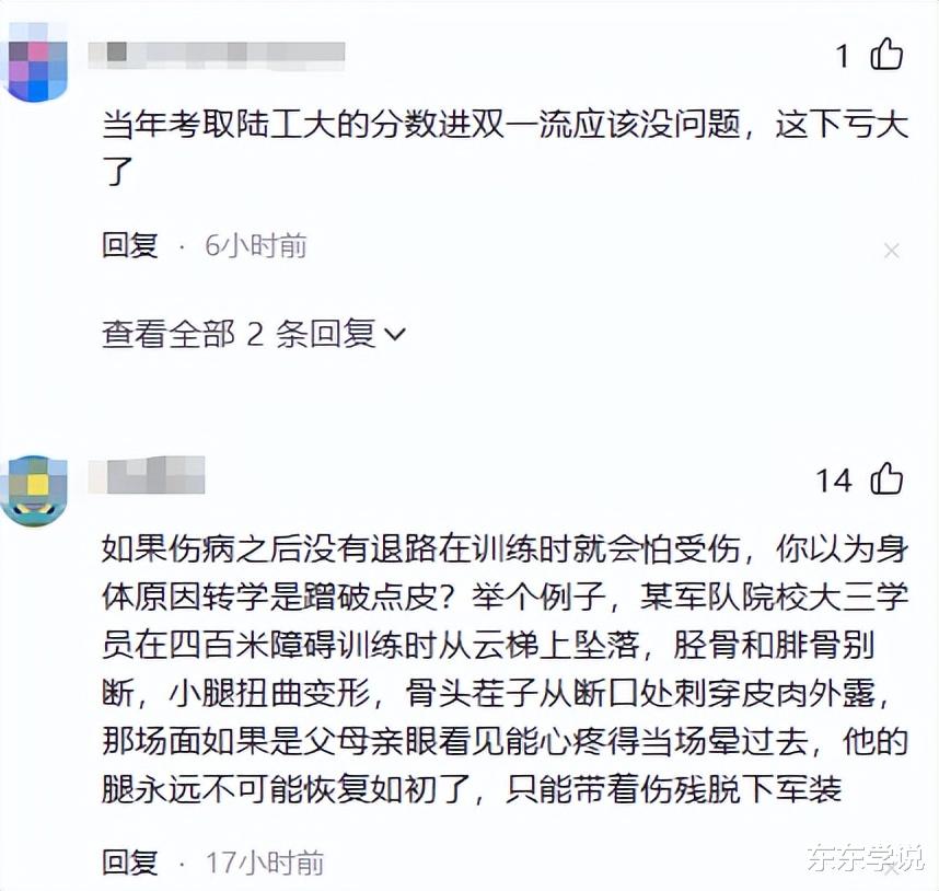 军校生的录取要求是非常高的,加上南京的城市优势;这些人当年估计都是211的分数才可以上陆军大的;现在半途而废转到普校,确实很亏,但是身体不适应,只得走一步!