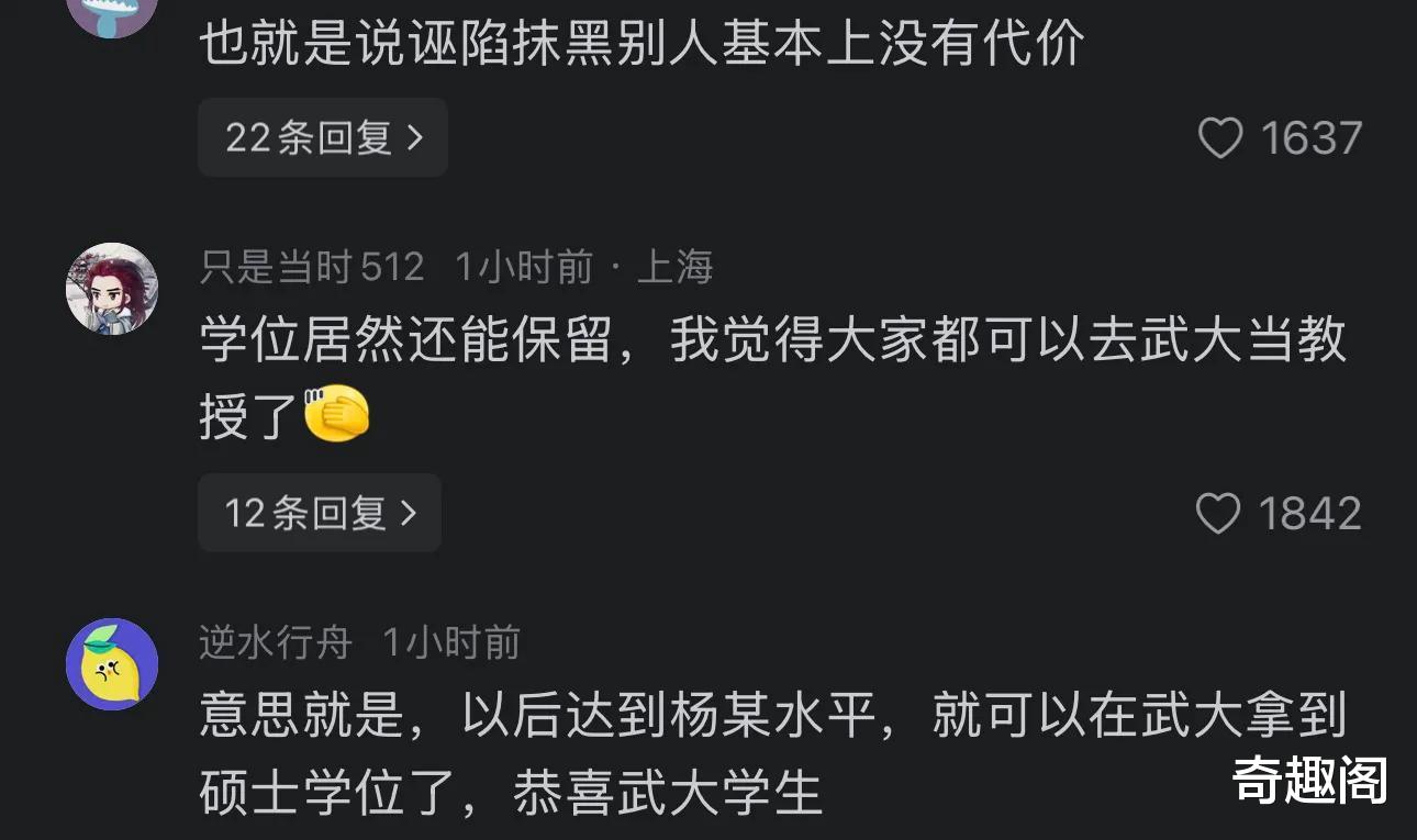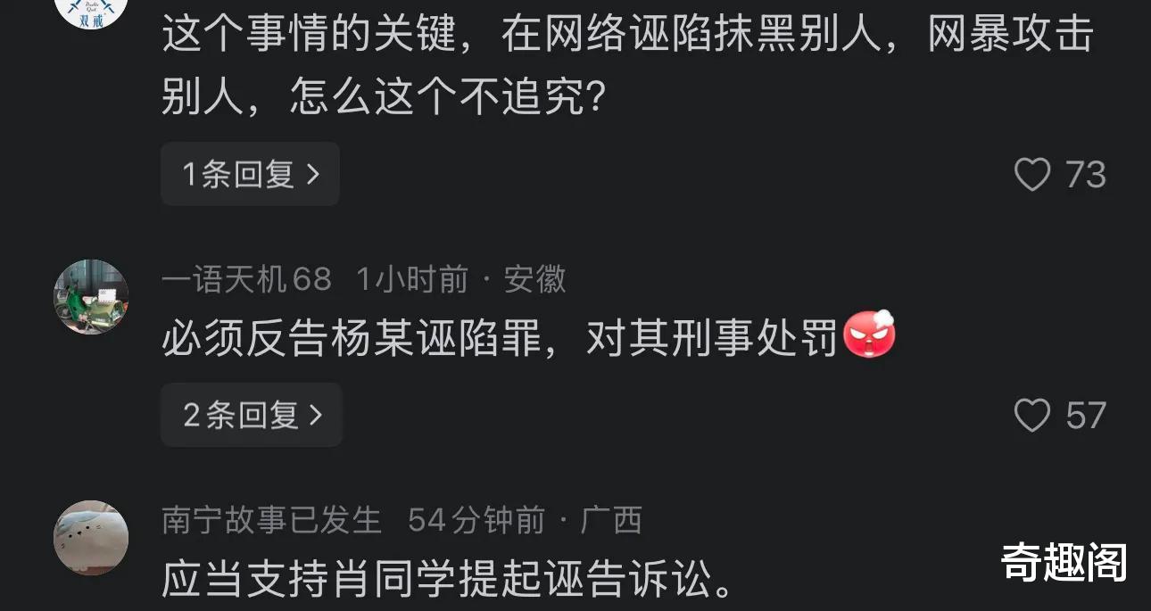 但是有部分网友认为,就算在学术方面没有问题,但是杨某媛对于诬告肖同学,以及事后所发表的言论,都表示这个人的人品和道德有绝对的瑕疵。最后的处理结果,难道啥事儿都没有吗?网友作为吃瓜群众,虽然不能直接参与到学校的管理决策中去,但也有权利表达自己的看法和意见。通过理性的讨论和监督,促使学校更加重视这些问题,为教育环境营造一个更加健康、和谐的氛围。对此,你们怎么看呢?