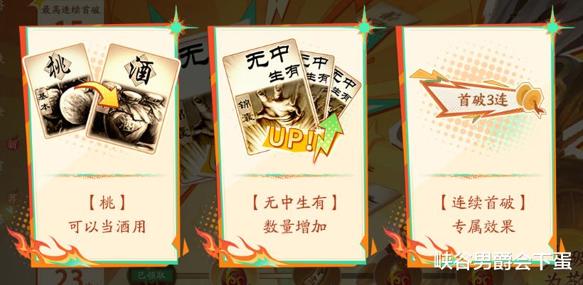 基础牌【桃】的功能也将限时升级。活动期间,【桃】从单一的“回血利器”增加了【酒】的功能。所以到了关键时刻,是选择常规回复体力保住性命,还是为下一张【杀】叠加“伤害+1”的效果,可能会使结局大大不同。让“用桃”从“本能操作”变成“策略博弈”,大幅提升了牌局的深度。