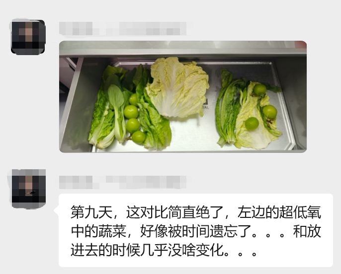 有内测的用户分享,九天后普通保鲜抽屉中的蔬菜已明显发蔫泛黄,而超低氧环境中的仍如刚采摘般鲜绿饱满,“仿佛被时间遗忘了”。