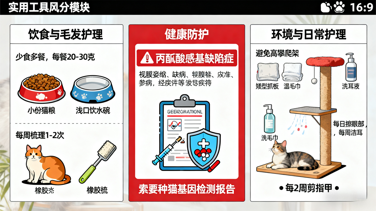 2. 寿命与体检平均寿命 12-15 年,良好养护条件下可延长至 16 年以上。建议每年进行一次全面体检,重点检查血常规(排查贫血)、眼部健康(预防视网膜萎缩)、骨骼状况(监测骨折风险);老年猫(10 岁以上)每半年体检一次,及时发现潜在健康问题,通过饮食与药物干预延长健康寿命。