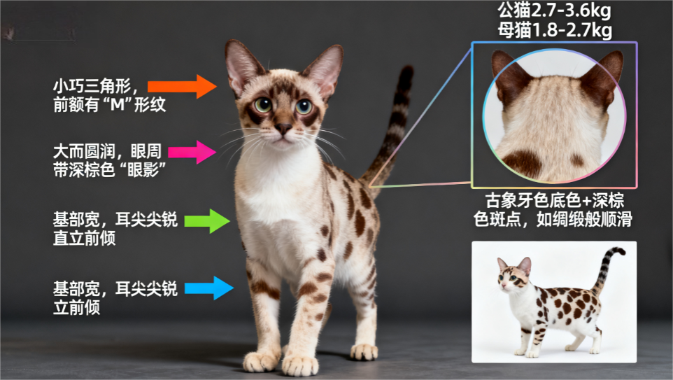 五、品种标准与辨别要点(一)国际品种标准CFA 对新加坡猫的评分标准极为细致,总分为 100 分:头部 15 分(头部形状 4 分、眼睛间距 4 分、口鼻形状 4 分、轮廓 3 分)、耳朵 10 分(形状大小 4 分、分布 4 分、宽阔度 2 分)、眼睛 10 分(大小 6 分、形状 3 分、颜色 1 分)、身体四肢尾巴 20 分、被毛 15 分、颜色斑纹 30 分。标准明确要求:体型必须符合迷你特征,斑纹清晰呈刺鼠纹,眼睛需有 “眼影” 效果,不符合上述特征的个体无法参与赛事。