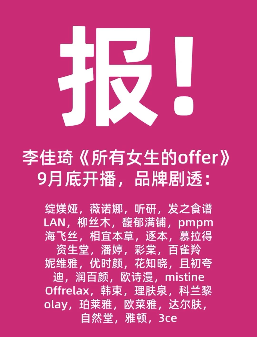 此外,据小红书账号直播圈速报显示,李佳琦团队推出的电商综艺《所有女生的offer》将在9月底开播,传闻品牌剧透有绽美娅、薇诺娜、听研、柳木丝、馥郁满铺、相宜本草、逐本、彩棠、百雀羚、花知晓、优时颜等国货美妆品牌,还有妮维雅、欧莱雅、资生堂、理肤泉等外资美妆品牌。