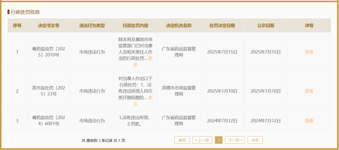 另据国家企业信用信息公示系统显示,广东优亿美化妆品有限公司共有3条行政处罚信息,其在2025年接连被罚:1月罚款19万元、7月被吊销化妆品许可证。此前在2024年7月就曾被罚17万元。