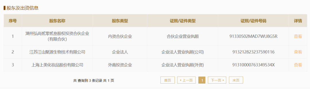 具体来看,聚源上美是由上美股份与江苏江山聚源生物技术有限公司(以下简称:聚源生物)共同投资,湖州弘尚贰零贰叁股权投资合伙企业(有限合伙)为内资合伙企业,聚源生物为企业法人,上美股份则为外商投资企业。