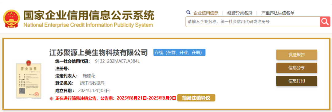 日前,据国家企业信用信息公示系统显示,江苏聚源上美生物科技有限公司(以下简称:聚源上美)正在进入简易注销程序,公告期为2025年8月21日-2025年9月9日。