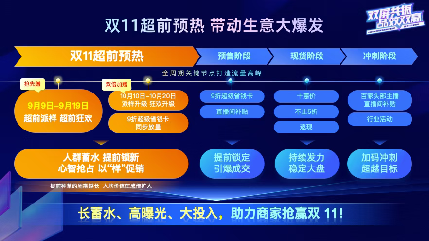 据天下网商公众号显示,今年双11即将进入超前预热,在9月9日、10月10日两个节点,电视淘宝将进行各为期10天的派样,通过超前预热帮助品牌积累种子用户,提前锁定大促人群。