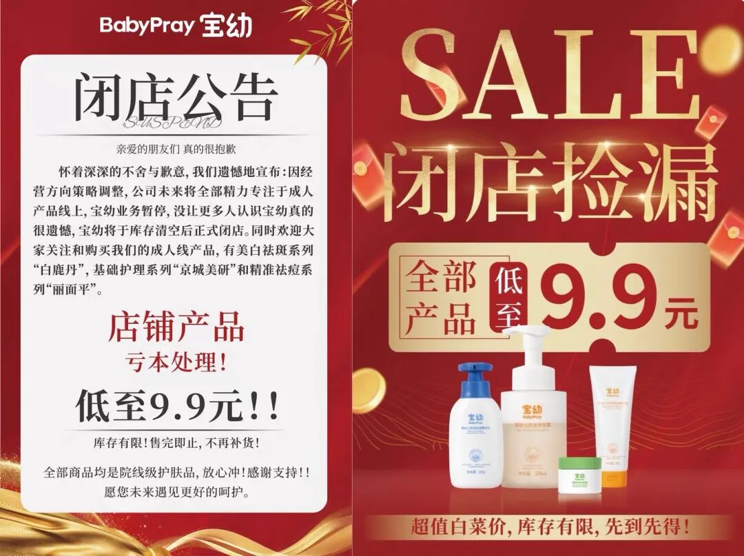 近日,婴童护肤品牌BabyPray宝幼(以下简称:宝幼)在其天猫官方旗舰店发布了一则闭店公告,公告显示:“因经营方向策略调整,公司未来将全部精力专注于成人产品线上,宝幼业务暂停。”