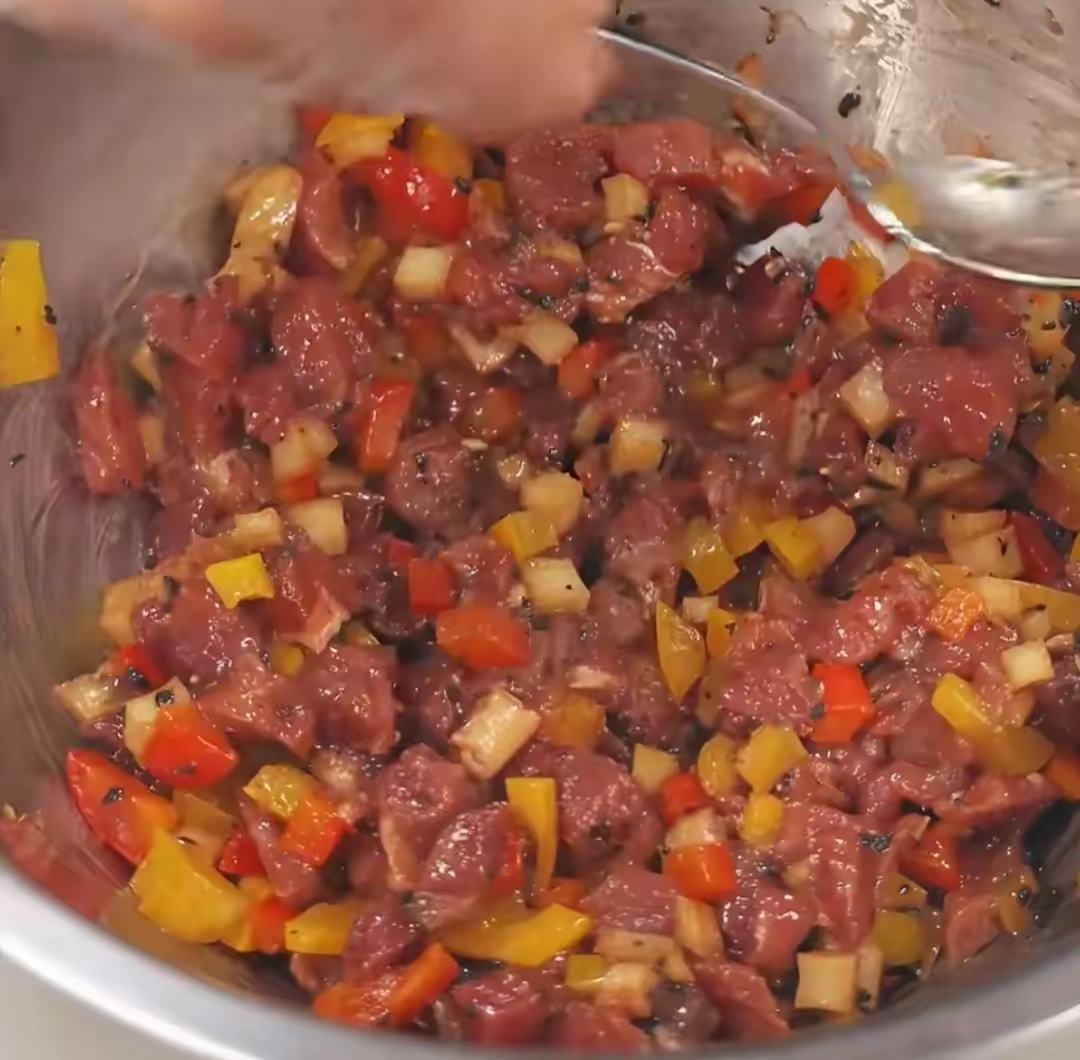 小贴士:在选择牛肉时,建议选用肥瘦适中的部位,这样炒出来的牛肉既不会太干也不会过于油腻。如果喜欢口感更加丰富的朋友们,还可以在牛肉馅中加入一些蘑菇丁或青椒丁等蔬菜,增加层次感。烘烤时间请根据自家烤箱实际情况调整,避免过度烘烤导致外皮过焦而内部未熟透的情况发生。