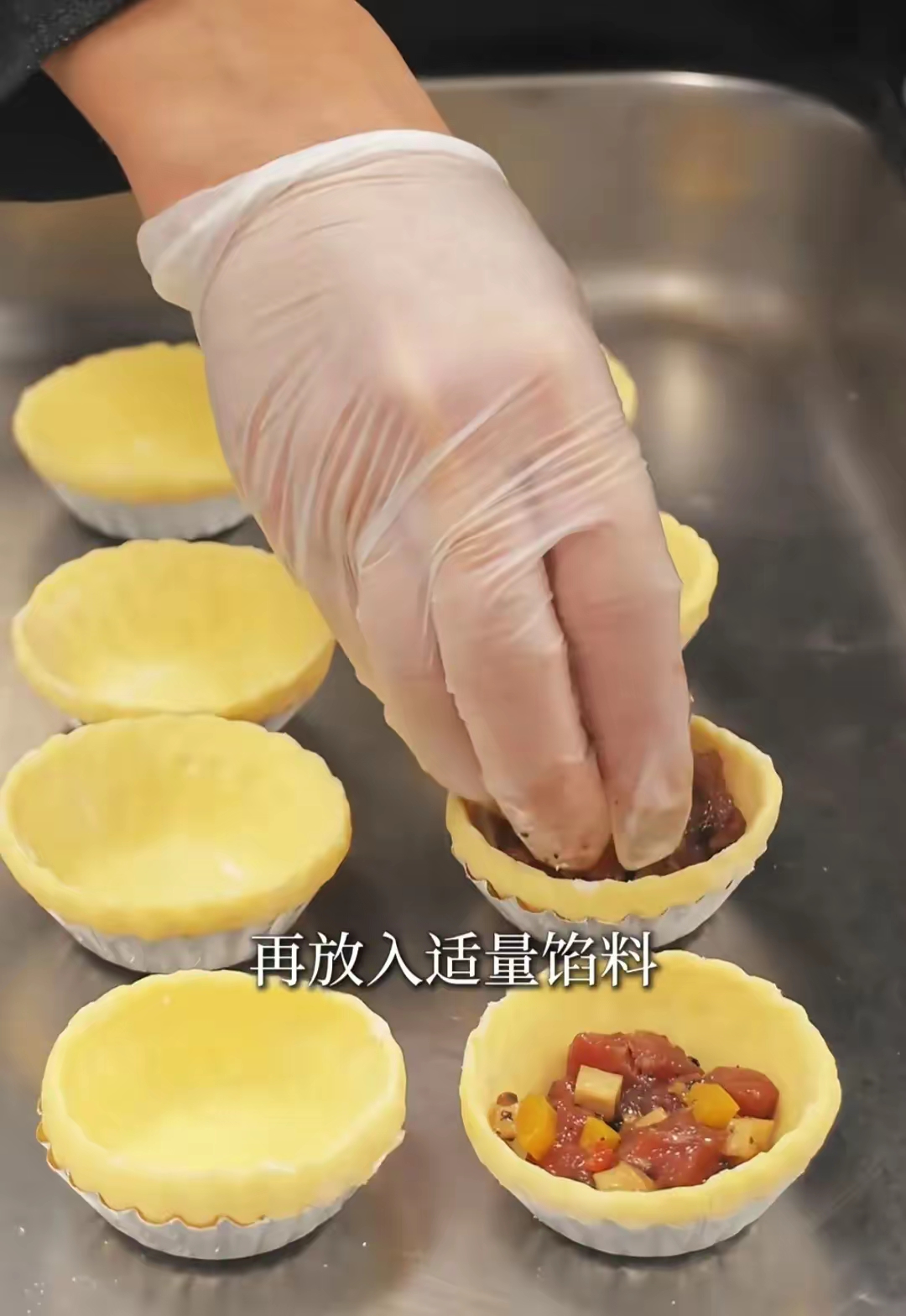 从冰箱取出挞皮面团,擀成厚度约为0.3厘米的薄片,然后用模具切割出适合填装的大小。将切好的挞皮放入挞模中,用手轻压使其贴合模具形状。接着,在每个挞皮底部均匀铺上一层炒好的牛肉馅,撒上一层厚厚的芝士丝。