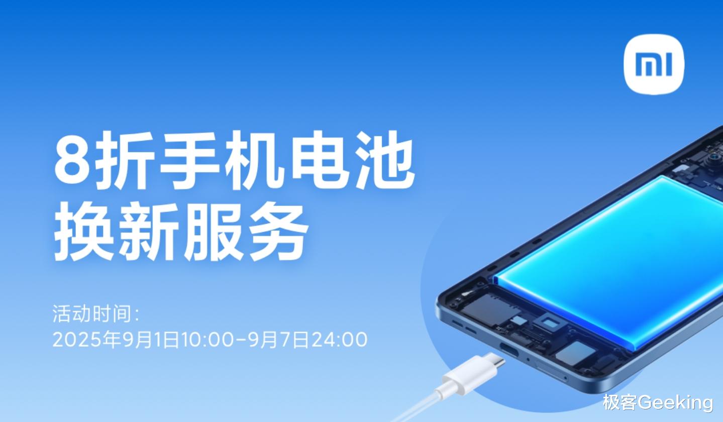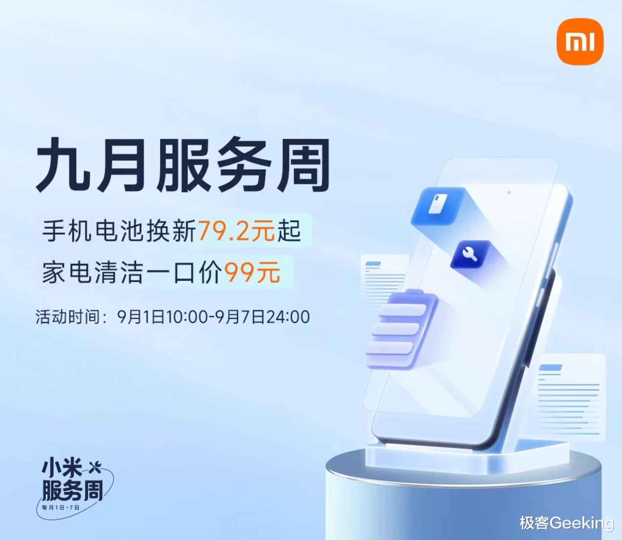 进入新的一个月 9 月,现在小米开启了又一轮的售后服务活动,官方称为是“9 月服务周”,服务内容包括 8 折手机电池换新和笔记本电脑 5 折深度清洁保养,以及大家电的清洁保养等服务内容,活动期限是 9 月 1 日到 7 日,同样是为期一周的时间,上一次活动期间不支持换电池的机型用户可以看一看这次是否有,有其它相关需要的读者也可以特别留意一下。