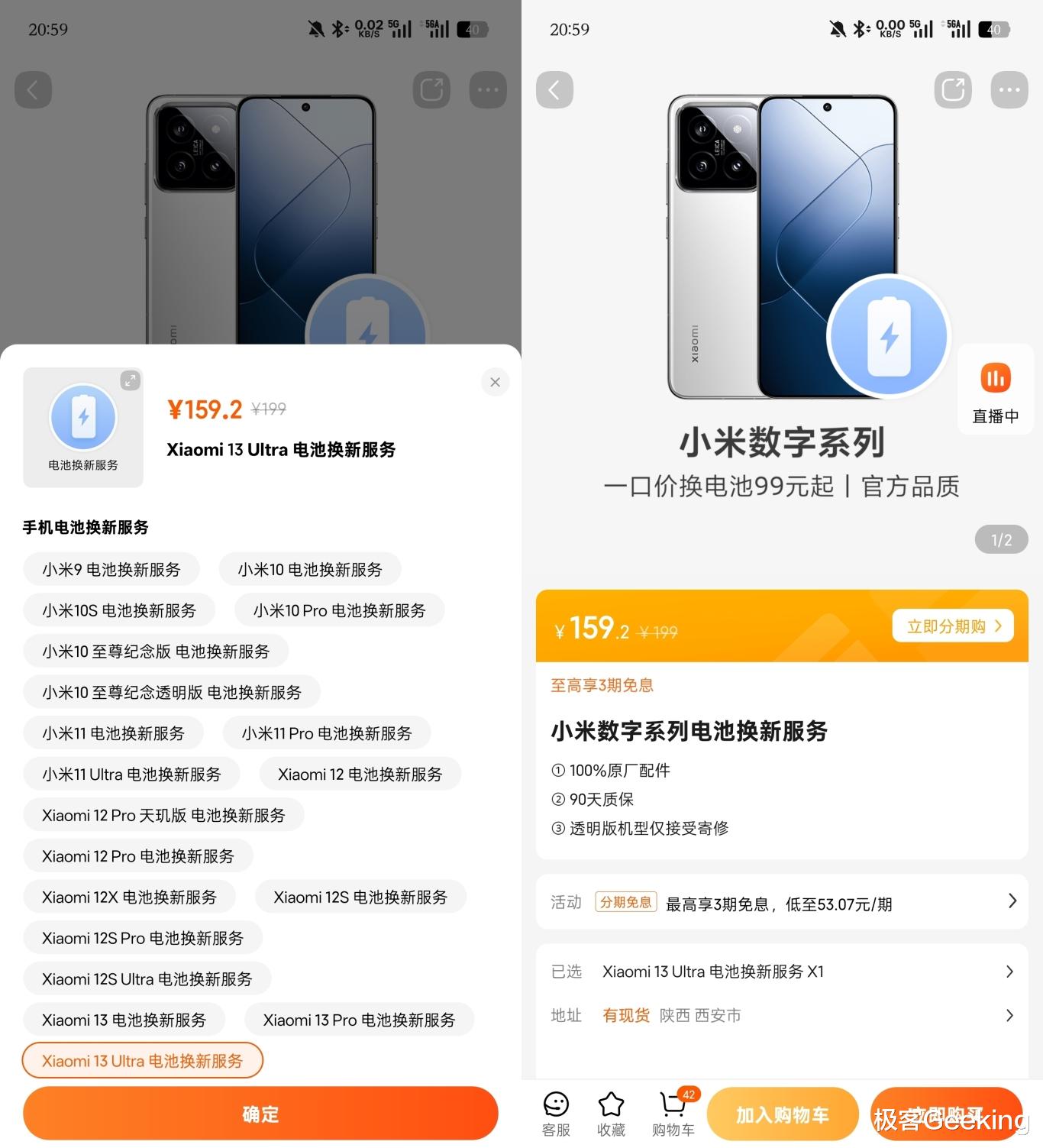 比如其中的红米K70,这款手机上市于 2023 年 11 月,换块电池的原价是 159 元,8 折活动价则是 127.2 元,同时有其他多款机型的换电池活动价格也是如此。再如小米10 青春版,换电池折扣价是 79.2 元。