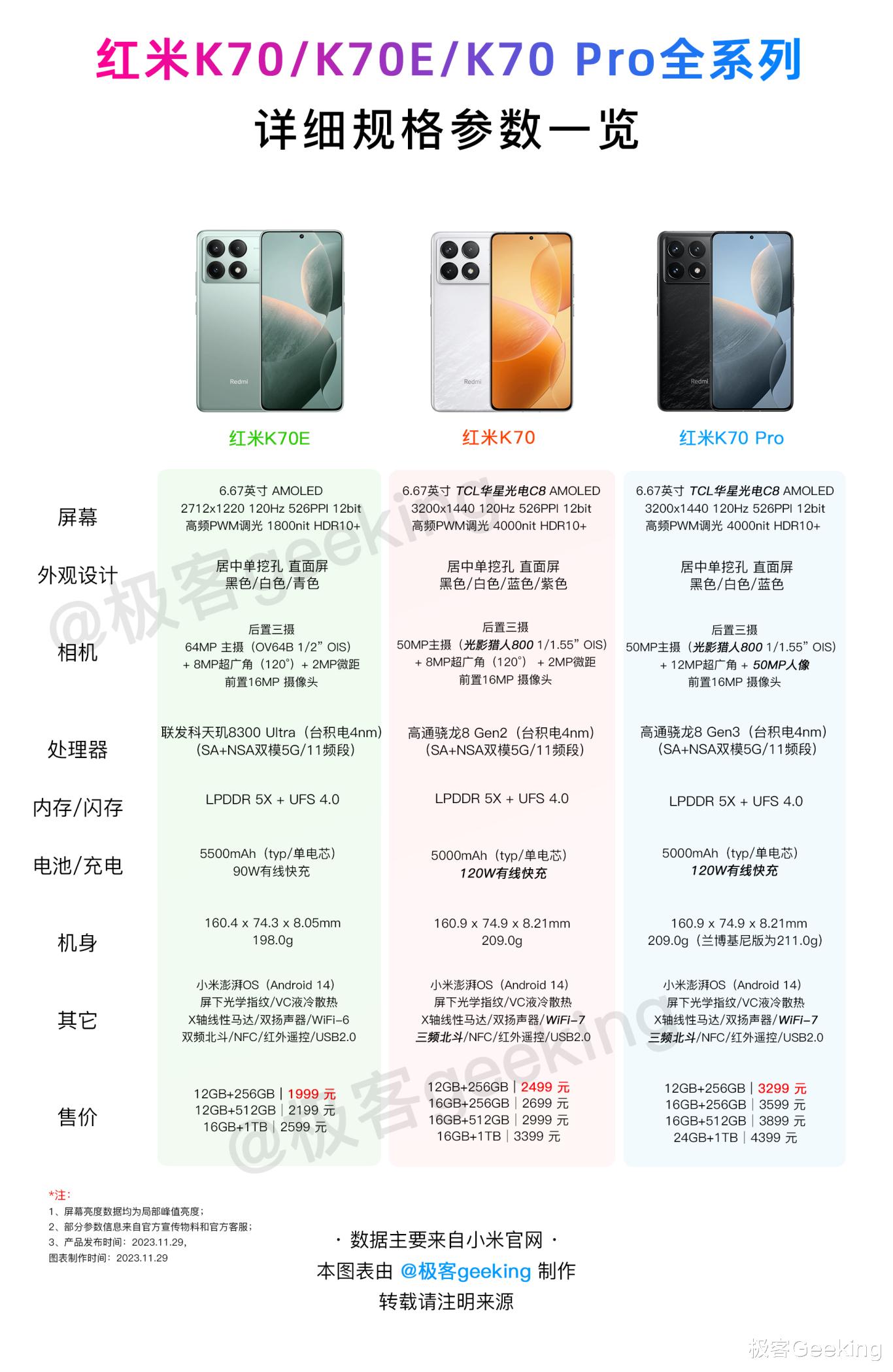 回顾红米K70 系列三款旗舰手机的一张图完全总结如下: