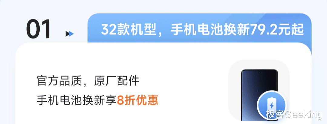 对于这一轮 9 月的小米服务周活动,对比以往总结来说,服务项目依然缺席了 8 折平板电池换新和手机后盖 8 折换新的活动,不过 8 折手机电池换新服务的支持机型和上一次有很少重叠,这对于上一次没能等到折扣的用户来说很友好,那么现在这次有你准备要换电池的机型设备吗?