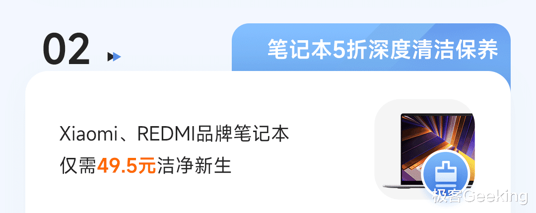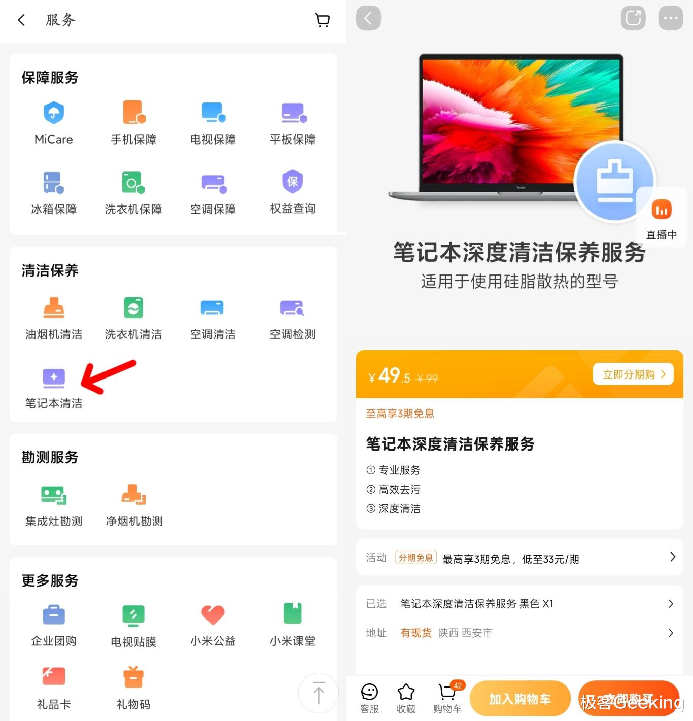 下单方式同样是在小米商城 App 的「全部服务」页面,下滑点击打开「清洁保养」-「笔记本清洁」就能找到入口。