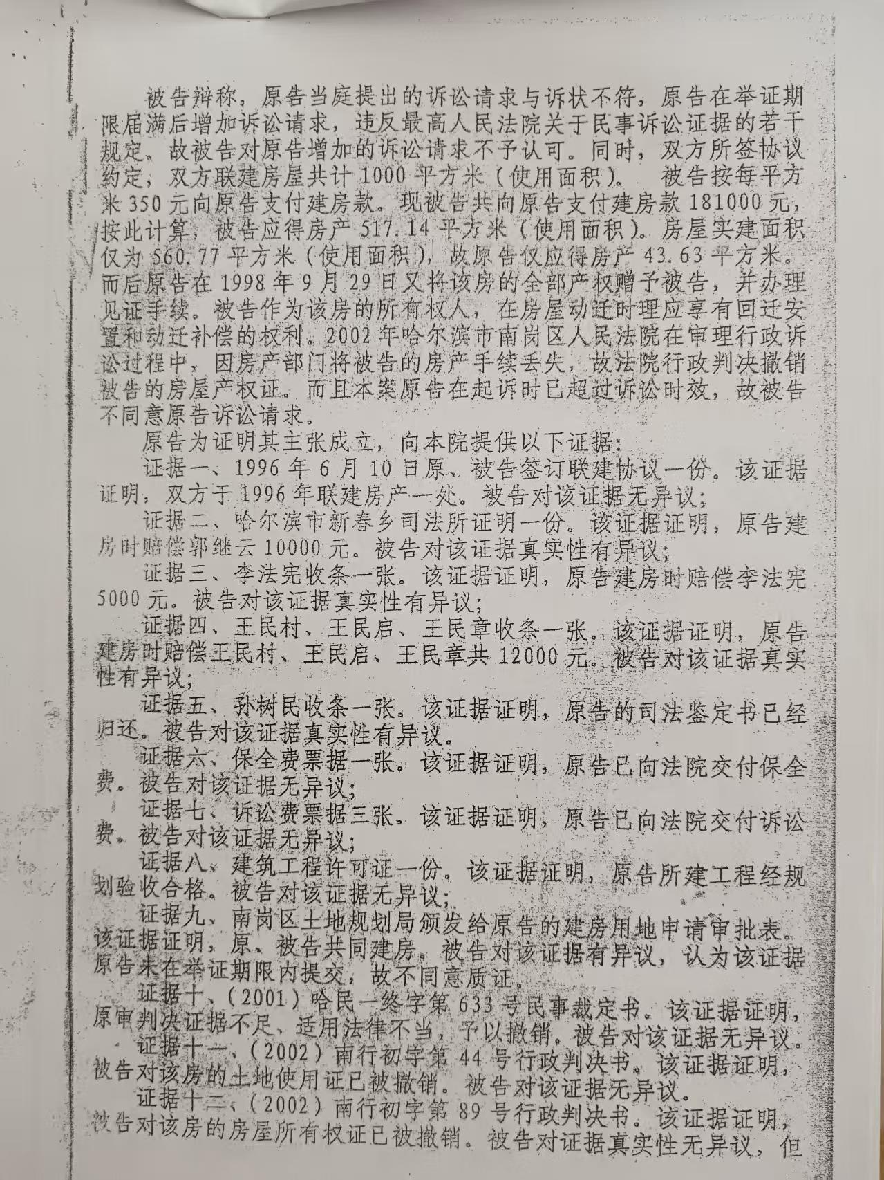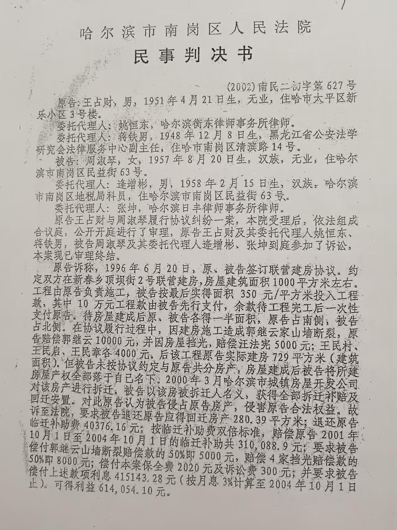 2002年周淑琴与王占财因一份联营建房协议产生纠纷,根据协议显示,双方在新春乡顶坝街联营建房,房屋建成后各得50%。然而随着房屋的完工,利益的天平开始倾斜,王占财声称周淑琴侵占了其应得的房产,遂将其诉至法院。