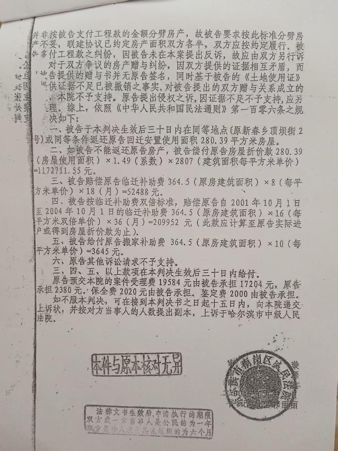2005年哈尔滨市南岗区法院作出(2002)南民二初字第627号民事判决书,确认周淑琴只需履行金钱给付(本金117万及临迁补助费等费用)或房产交付(使用面积280平方米)其中一项义务。经哈尔滨市中级法院再审和黑龙江省高级法院再审,两次再审均维持一审判决。