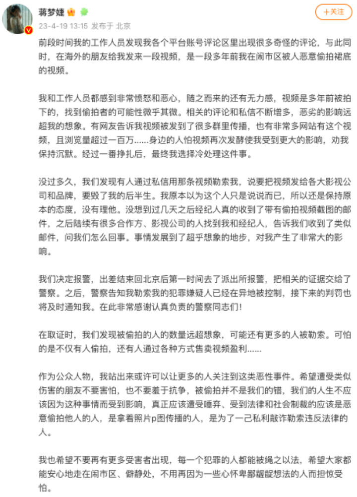 4月19日,出演《新红楼梦》《春娇救志明》的女演员蒋梦婕发文称,称多年前被恶意偷拍裙底,近日又因为该视频遭勒索,目前报警后嫌疑人已被控制。