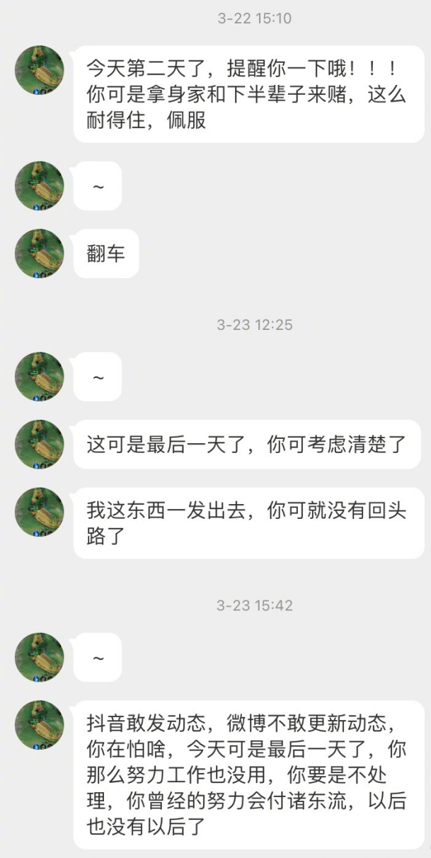 3月23日,该网友再次给蒋梦婕发私信,“你可是拿身家和下半辈子来赌,这么耐得住,佩服”,“我这东西一发出去,你可就没有回头路了”。