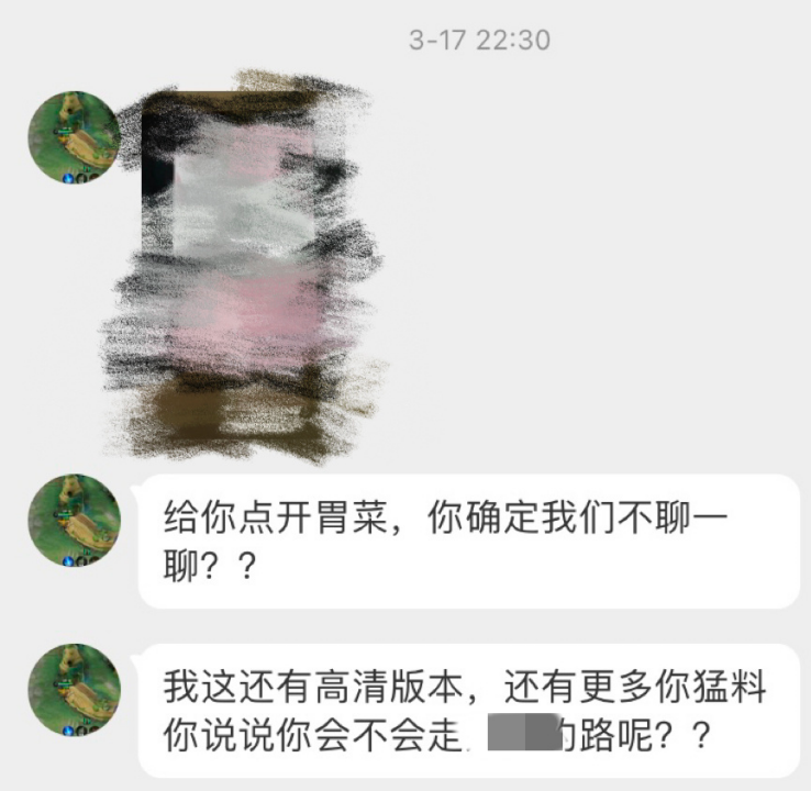 3月18日,勒索人称自己的耐心有限,这么做只是为了求财。并威胁道:“一天之内,再没有回应我可就把材料和视频卖给有需要的人了”,“视频我会放到成人视频国产区,设置会员观看”。