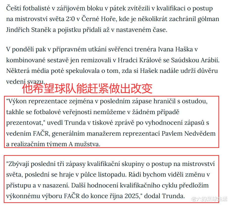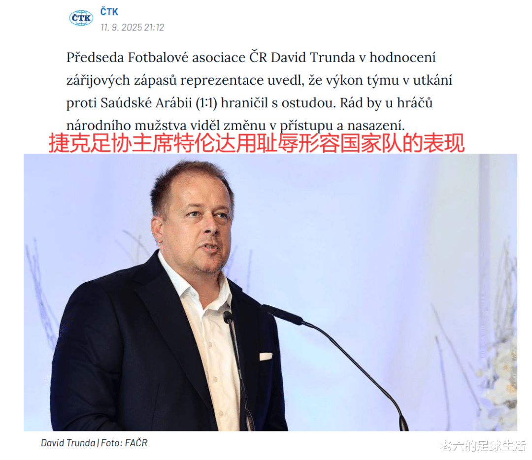 捷克足协的主席戴维·特伦达评价国家队在9月份比赛的时候提到球队在对阵沙特比赛中的表现堪称耻辱,他希望能看到国家队球员在态度和投入上有所改变。