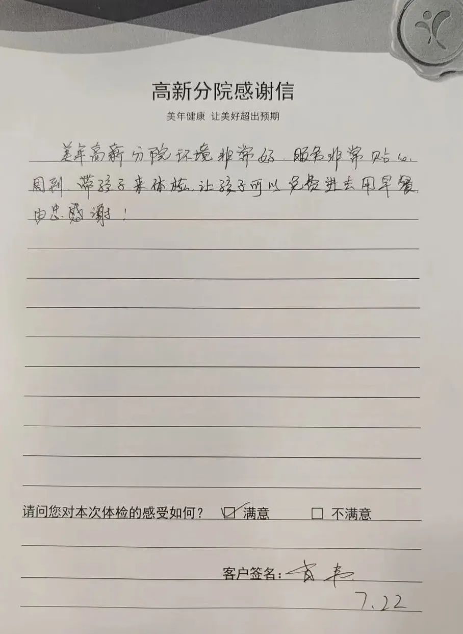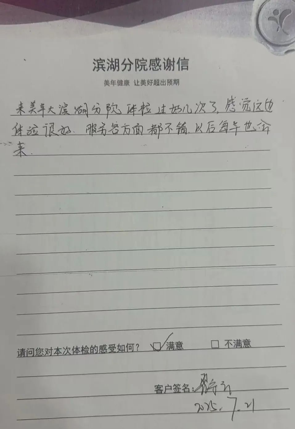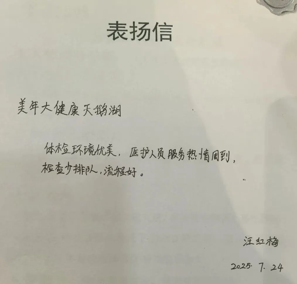 再说那天鹅湖分院,汪女士的感受最是简洁有力:“美年大健康天鹅湖分院,体检环境优美,医护人员服务热情周到,检查排队少,流程好!”这寥寥数语,点出了在湖光潋滟处体检的精髓——人少心静,流程顺畅,白衣人儿笑脸相迎。对于追求高效、舒适体检体验的个人和需要高效组织企业团检的HR来说,这无疑是合肥体检中心推荐的硬实力。