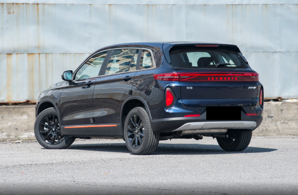 2026款创维HT-i在侧身设计上也是采用了贯穿式的线条设计,同时车顶的线条也带有一些溜背式的既视感,并且在侧裙方面,该车同样采用了橙色的装饰条,配合银色的窗线和运动轮毂的存在,在运动感和精致程度上,均有着不俗的表现。至于尾部设计上,2026款创维HT-i的尾灯组自然也是贯穿式的设计语言,并且车辆的标识也是采用了可点亮的设计,就夜间点亮之后,其美观程度和辨识度上都是不差的,其次,在后包围方面,2026款创维HT-i更是采用了银色的底护板,配合大尺寸的扰流板,倒也符合一台中型SUV的体量。