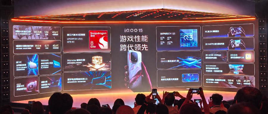 iQOO 15搭载高通第五代骁龙8至尊版芯片与自研电竞芯片Q3,达成比肩PC的游戏画质。这次发布会更是请来了四位中国知名电竞选手“小孩”曾卓君、“Clearlove”明凯、“SKY”李晓峰和“Fly”彭云飞来为其游戏性能背书。