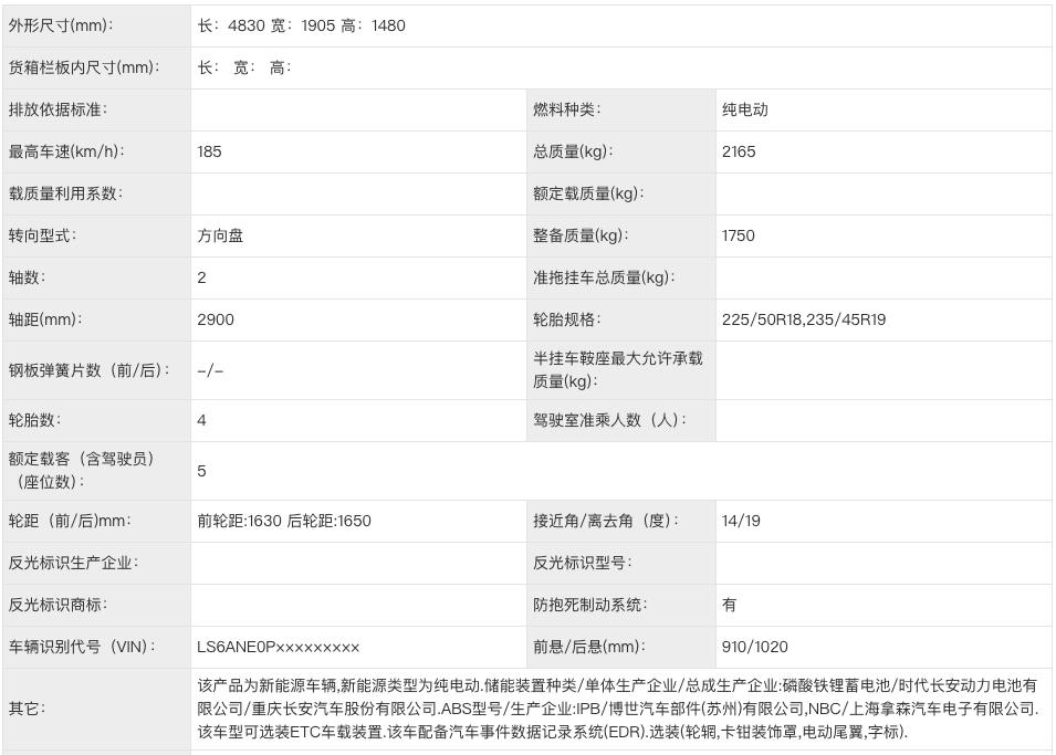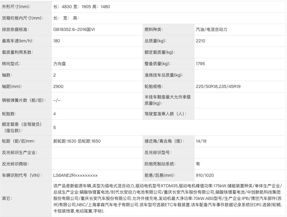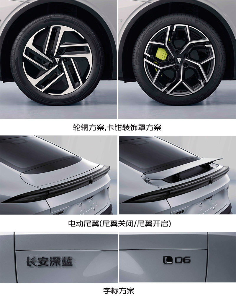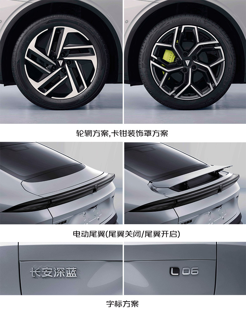 申报数据显示,深蓝L06增程版和纯电版车身尺寸一致,长宽高均为4830/1905/1480毫米,轴距为2900毫米,定位于中型车。此外,深蓝L06纯电版和增程版提供2种轮辋样式、电动后扰流板等选装。