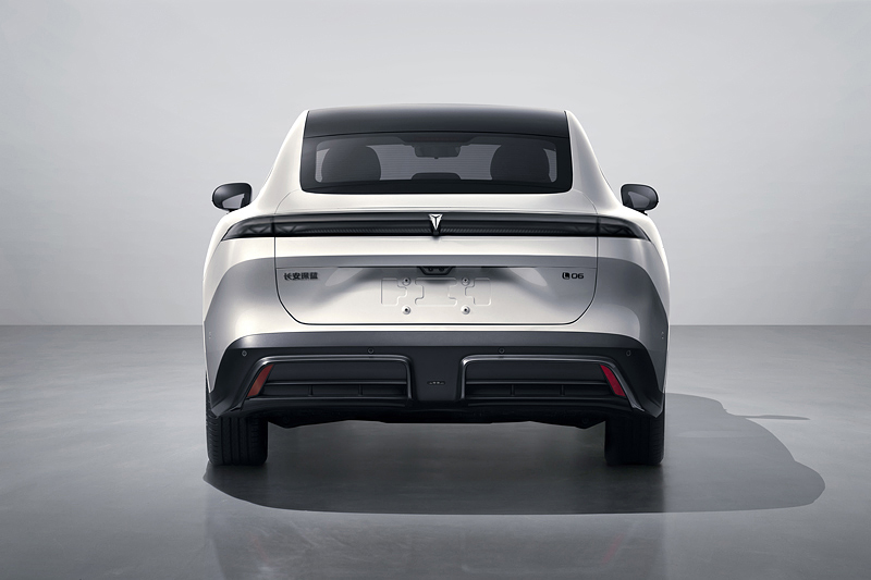 车尾部分,深蓝L06配备贯穿式尾灯组,中间为可发光的深蓝车标,后牌照框设计在尾门中央位置。同时,尾门两侧分别为“长安深蓝”和“L06”标识,并且增程版采用隐藏式排气布局。