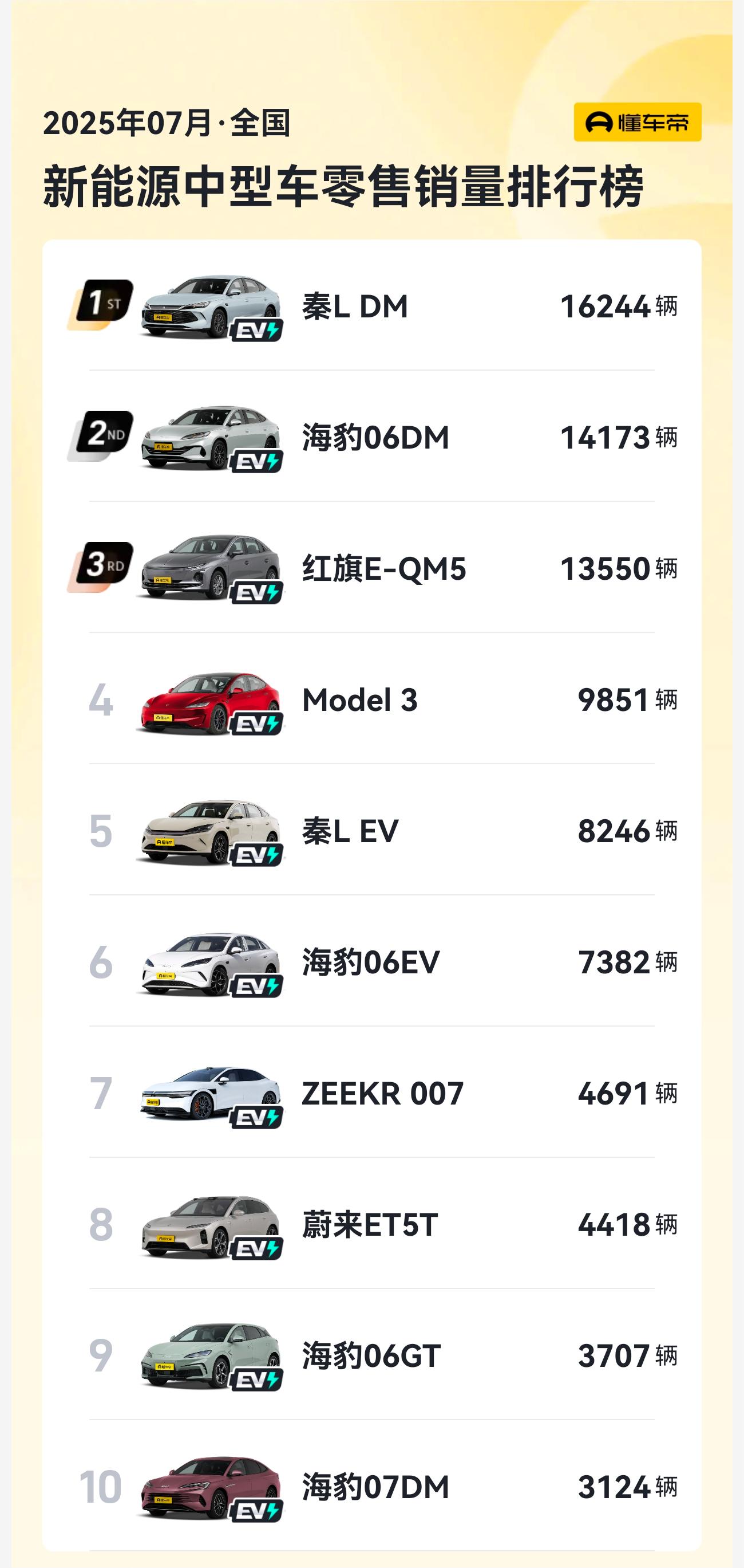 根据车型级别来看,预计深蓝L06同级车型包括比亚迪秦L DM/EV(指导价格9.98万元起)、比亚迪海豹06DM/EV(指导价格9.98万元起)等。结合销量数据显示,今年7月,在新能源中型车市场,销量前三名分别为比亚迪秦L DM(16244辆)、比亚迪海豹06DM(14173辆)以及红旗E-QM5(13550辆)。