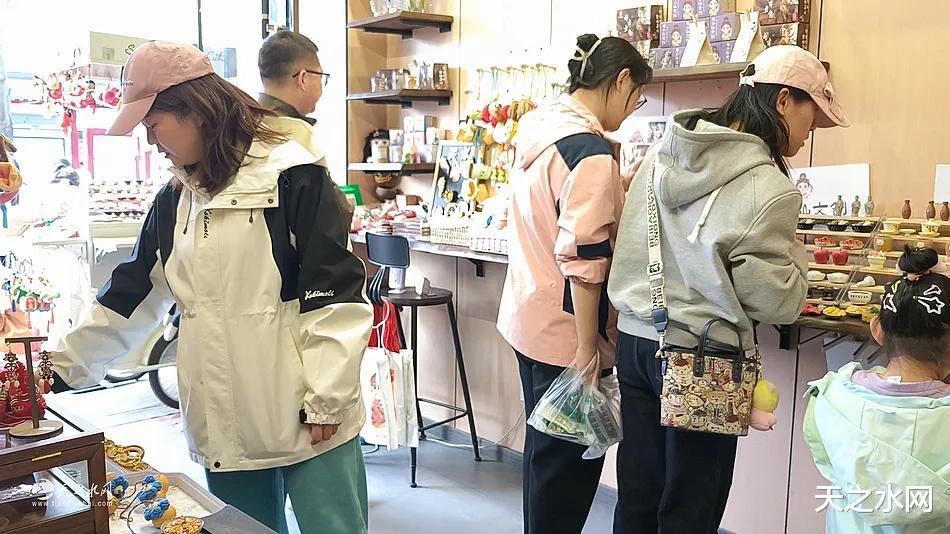 国庆期间,记者在“天小仙”文创店看到,店内摩肩接踵,来自全国各地的游客在品尝完美食后,纷纷涌入这里,为天水之旅挑选一份独特的纪念。货架上,以麦积山石窟、伏羲庙、花牛苹果、大地湾人头彩陶瓶、猪油盒、麻辣烫、呱呱等天水代表性文化元素设计的文创产品琳琅满目,备受青睐。游客们或细细端详,或与家人朋友热烈讨论,收银台前一度排起长龙。