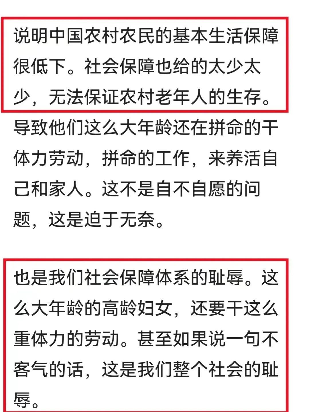他说社会保障给农村老人给的太少了,为了生存,他们被逼无奈,这是社会保障的耻辱,社会的耻辱。