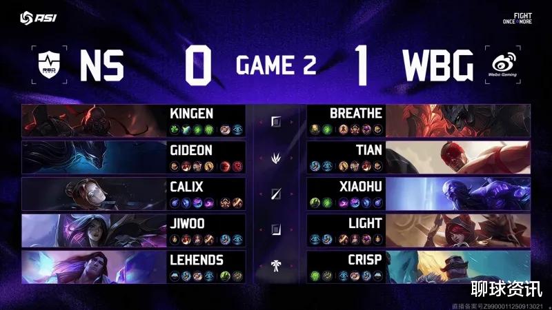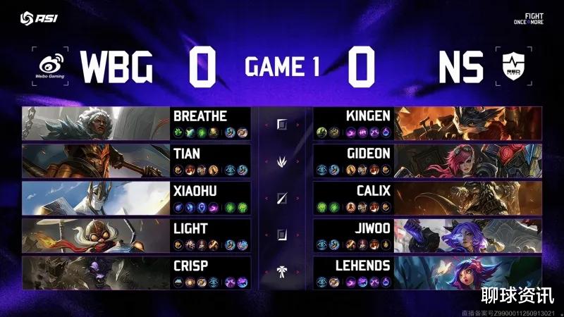 WBG(蓝色方)禁用英雄:沙皇、猴子、发条、卡莎、永恩选用英雄:Breathe(安蓓萨)、Tian(皇子)、Xiaohu(加里奥)、Light(飞机)、Crisp(牛头)