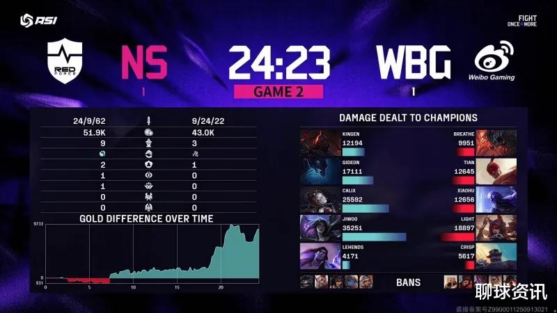 24:00:WBG 强行开团,Xiaohu 瑞兹被集火秒杀,NS 团灭 WBG 后直接一波结束比赛,耗时 24 分钟。