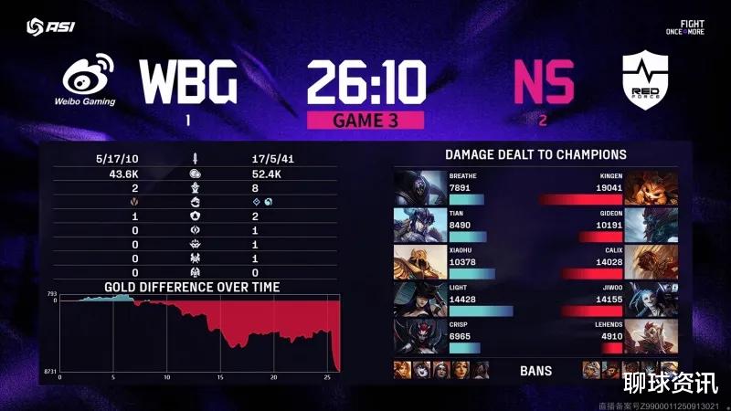 10:10:WBG 中路集结推塔,NS 防守反击,Lehends 宝石大招框住霞,NS 再杀两人扩大优势。