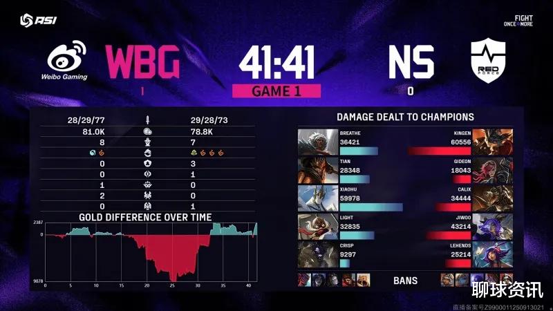 10:42:WBG 拿下第一条小龙(风龙),但 NS 通过换线推掉 WBG 上路一血塔,经济领先 2K。