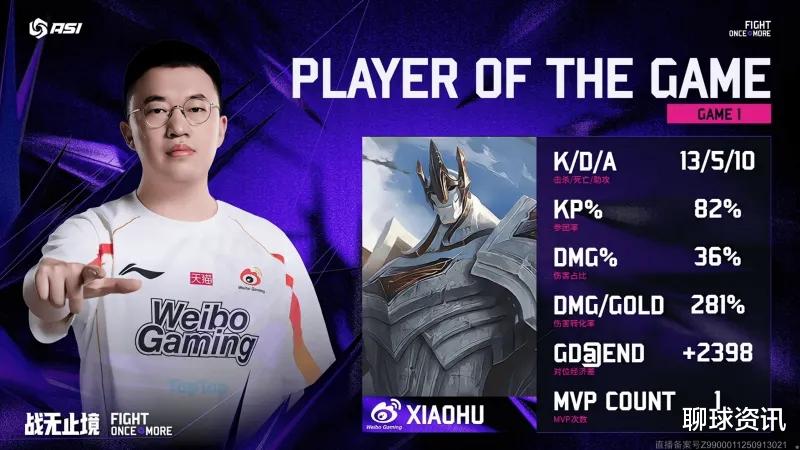 MVP:Xiaohu(加里奥),全场输出占比 38%,三杀终结比赛。