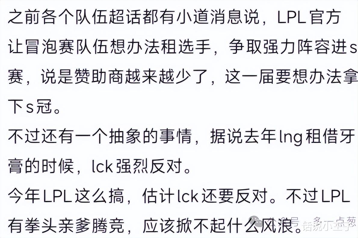 同时也有知情人对此进行爆料,世界赛前确实有一个比赛要打,不是正赛,是没有进入世界赛的队伍需要打。有不少粉丝根据这点信息推测出,很有可能是租借选手去世界赛队伍。有另外一名知情人他就直接说了,LPL官方让冒泡赛队伍想办法租借选手,争取实力强的阵容进入世界赛,说是赞助商越来越少了,这一届要想办法拿下s冠。不过去年LNG租借牙膏的时候,遭到LCK强烈反对。今年LPL这样租借选手,肯定也会遭到LCK强烈反对。不过问题并不大,LCK掀不起什么风浪。