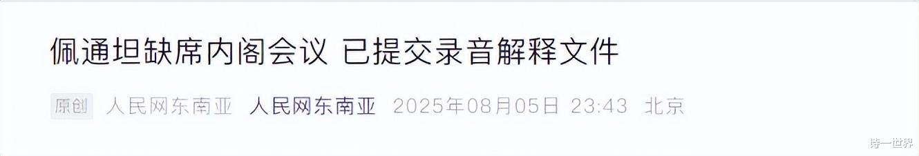 然而不到24小时,就是8月5日,佩通坦虽然总理被停职,但还可以且应以“部长身份”参加内阁会议,然而她缺席了,更为令人感到震惊的是,佩通坦团队并未就其缺席内阁会议的具体去向作出公开说明,就连总理随行人员面对媒体也三缄其口。