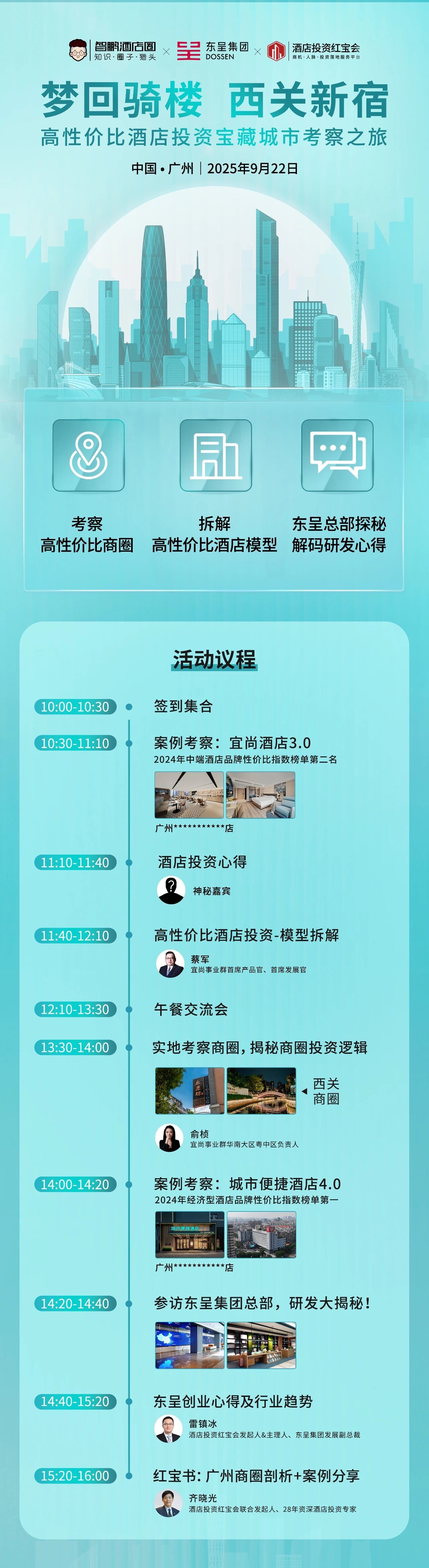 穿越骑楼古巷,邂逅西关新宿。由智鹏酒店圈×东呈集团×酒店投资红宝会联合举办,聚焦酒店投资新机遇的高性价比酒店投资宝藏城市考察之旅即将在9月22日于广州启幕,届时将为您揭开高性价比投资背后的商业逻辑与无限潜力。