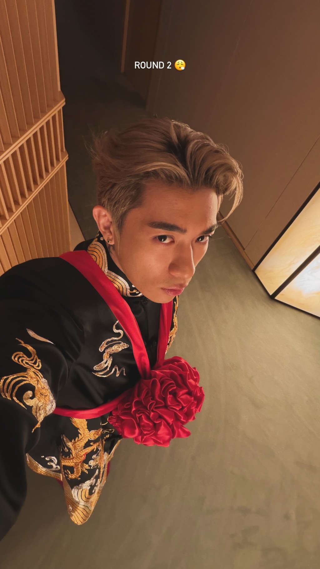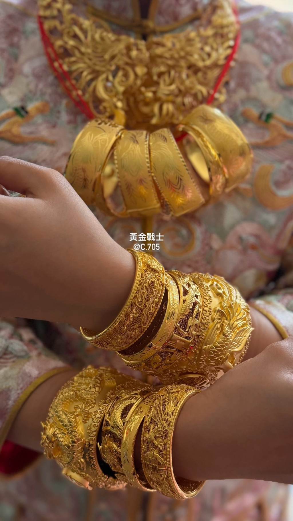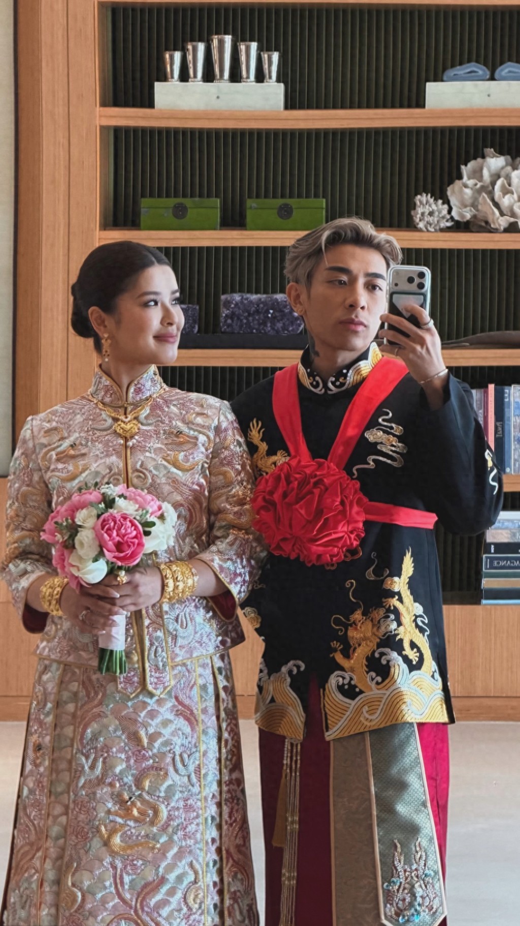 在今日的婚宴上,Christy身穿由金银线全手工刺绣的“褂皇”裙褂,佩戴的金器阵容更是令人瞩目。手上戴有4对龙凤镯,其中一对造型独特的“流星锤”款式格外吸睛,颈间佩戴巨型金项链,更挂有两对额外龙凤镯,整体造型雍容华贵。Tyson Yoshi同样身着金线绣制龙凤图案的长袍马褂,与传统新娘造型相得益彰。