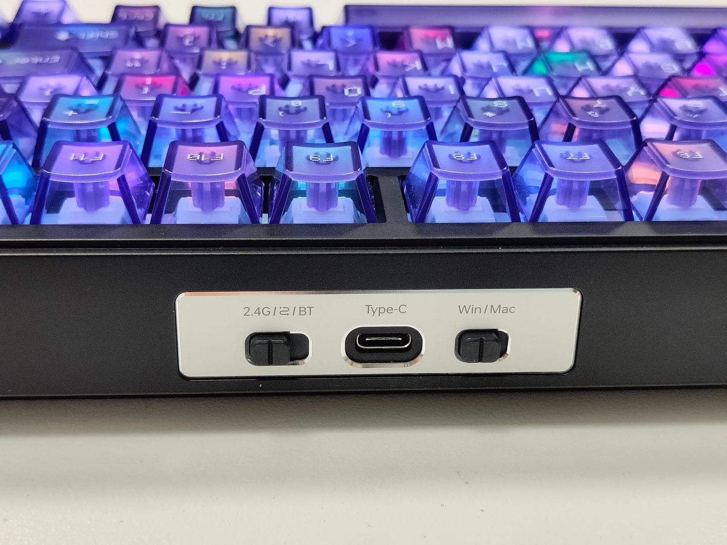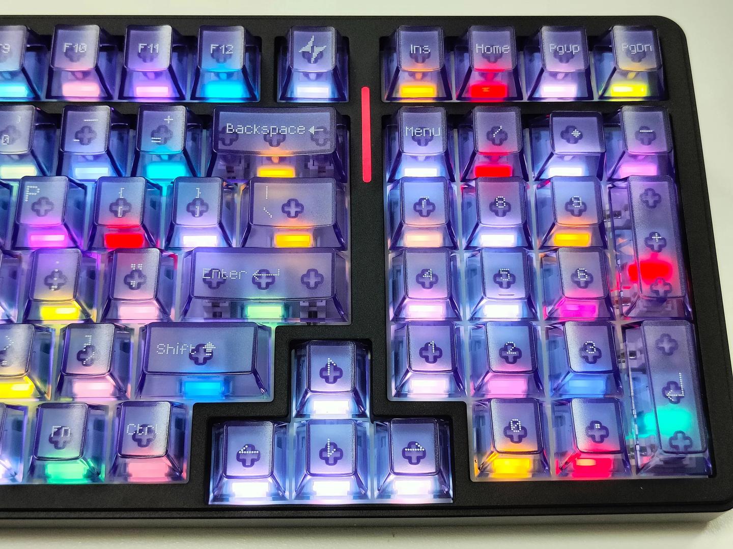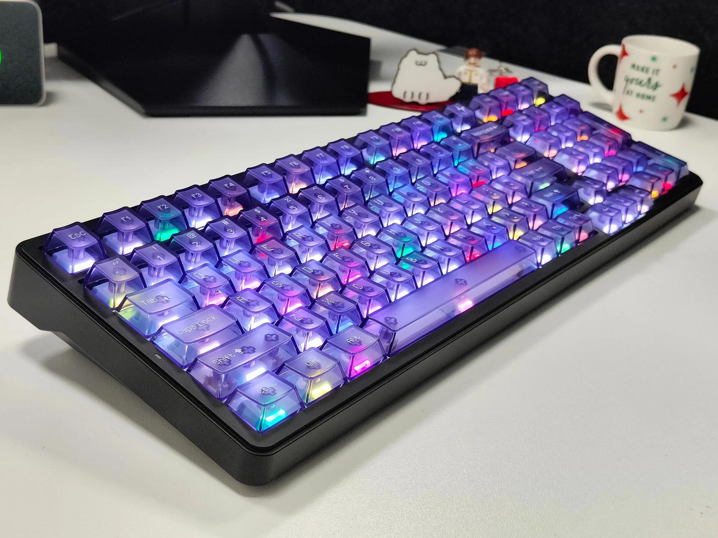 拆包装时挺惊喜,键盘、数据线、拔轴器、说明书一套齐,还额外补配了3个轴体。第一眼就被紫电配色戳中 ——PC 透光键帽不是扎眼的亮紫,像傍晚淡紫霞光,还有一种雾透效果,白天泛着细珠光,低调不呆板。